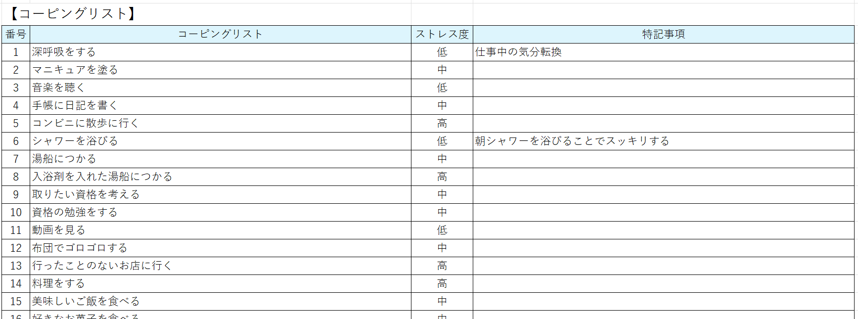 ストレスに対して自分なりの対処方法をまとめたリスト